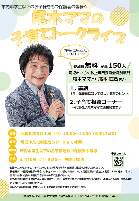 令和8年6月1日(月) 午後1時より アーラ小劇場市内小中学生の保護者のみなさま対象ですPTA本部役員さんは専用のフォームがありますので、お申込はお間違えのないようにお願いしますPTA本部役員専用フォームは各単PTA会長さんへお尋ねください 尾木ママトークライブ一般用チラシダウンロード FacebookXBlueskyCopy