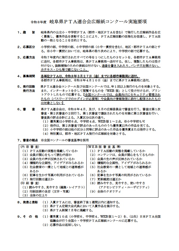 令和8年度 PTA広報紙コンクール実施されます。WEB版も受付あります。各単位PTA発行の広報紙の提出は 令和8年3月27日(金)までに可児市PTA連合会事務局まで提出ください。 FacebookXBlueskyCopy